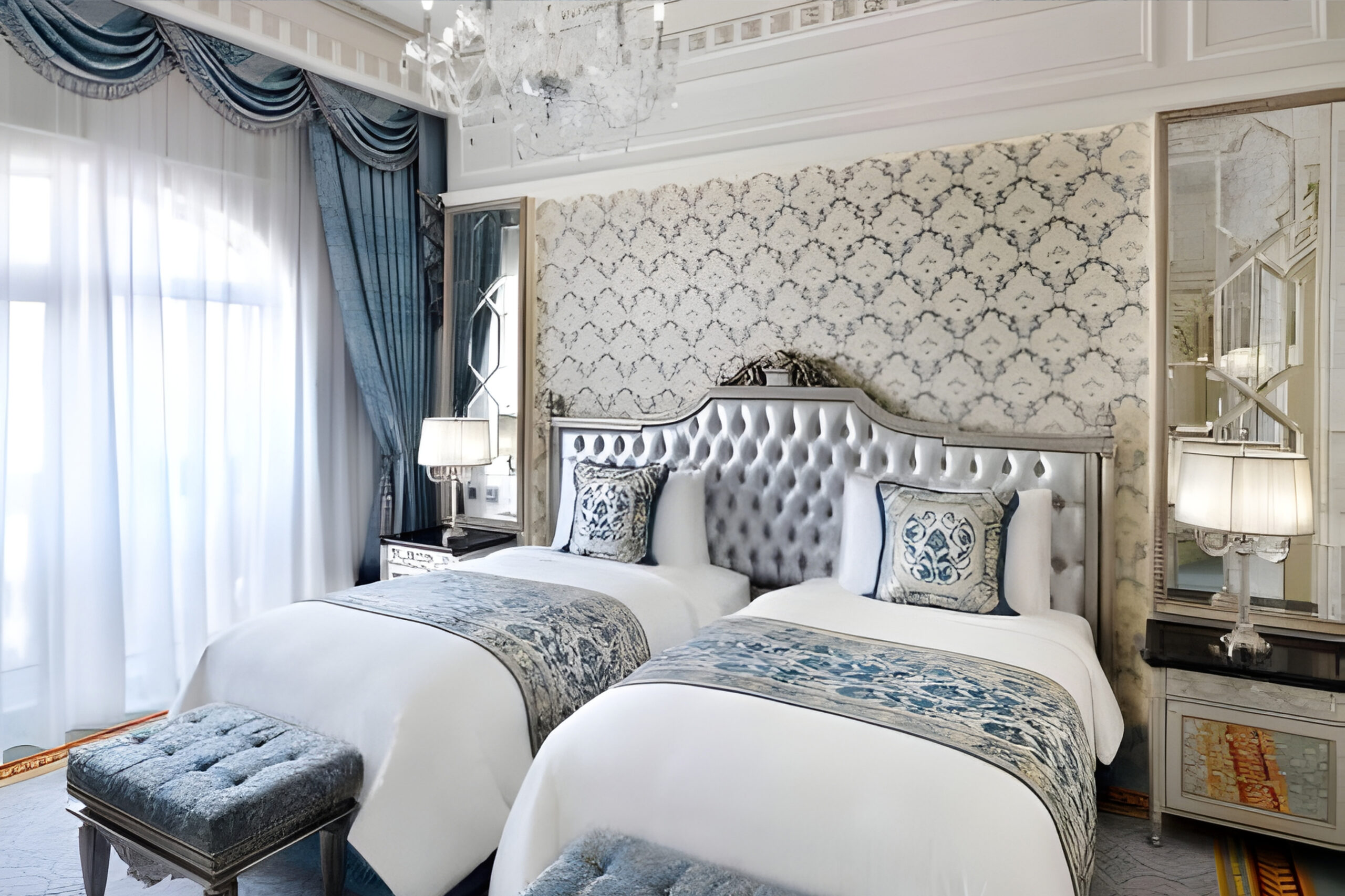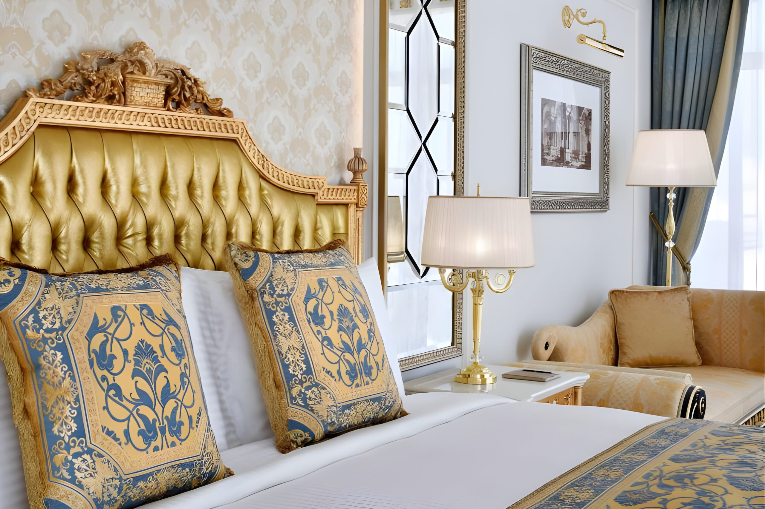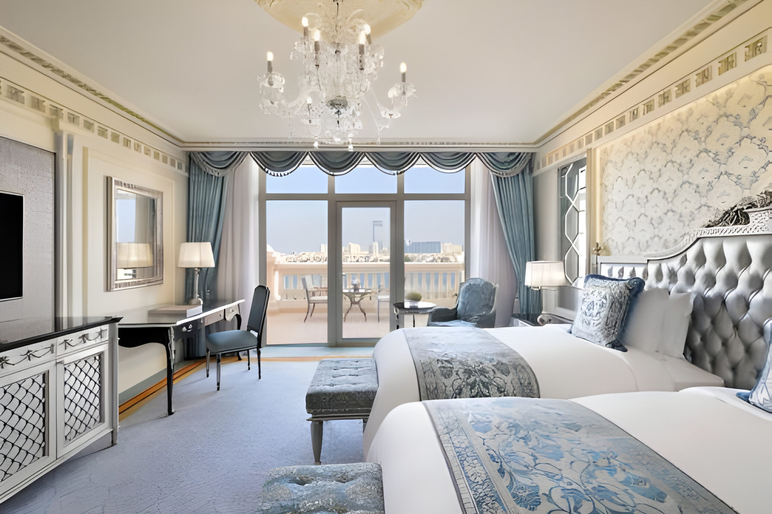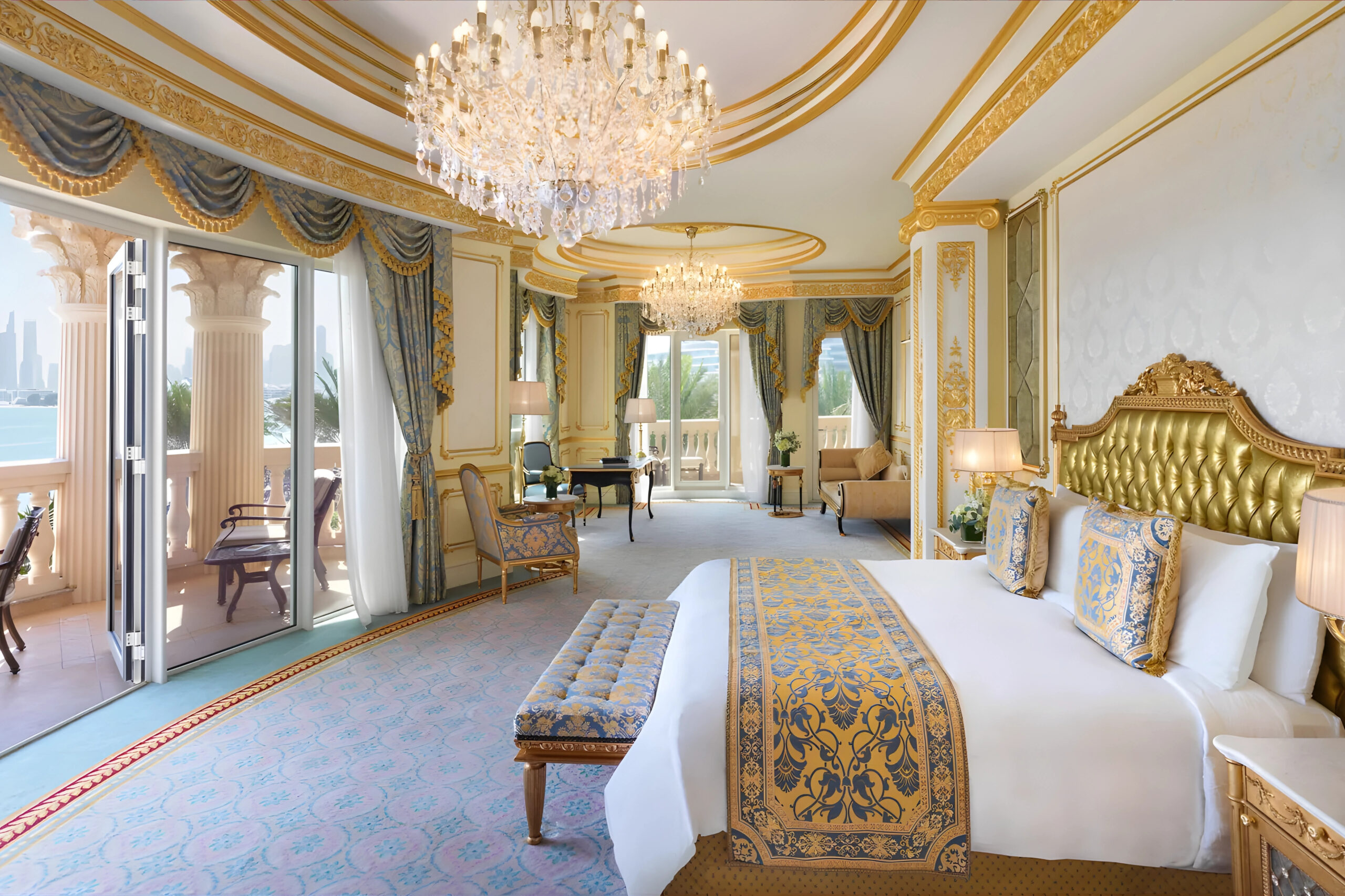 The guest rooms at Raffles The Palm reflect a refined blend of European artistry and contemporary comfort. Each space is adorned with bespoke Italian furniture, intricate gold and silver leaf detailing, and rich fabrics in soft, regal tones. Polished marble surfaces, crystal chandeliers, and handcrafted joinery elevate the sense of grandeur, while panoramic views of the Arabian Gulf complete the experience of palatial serenity.